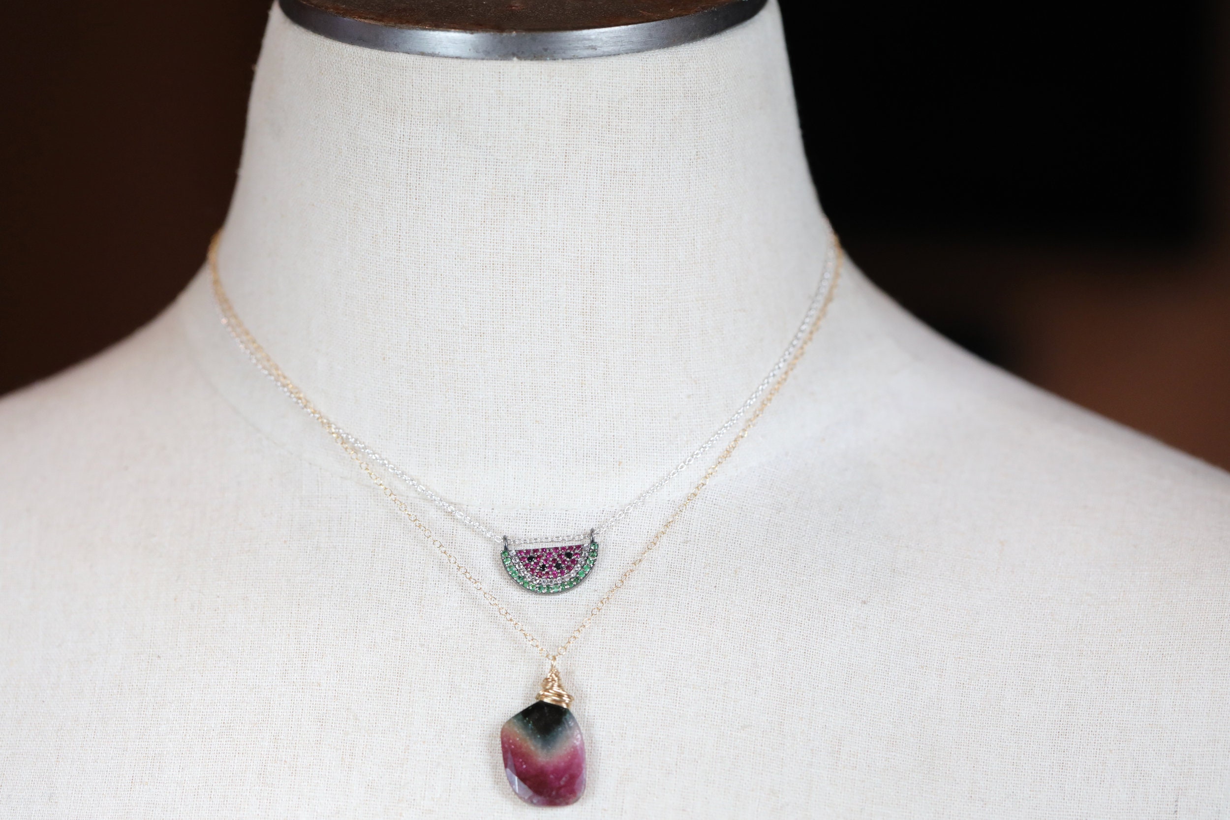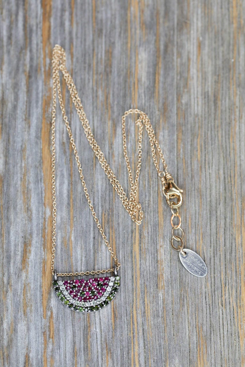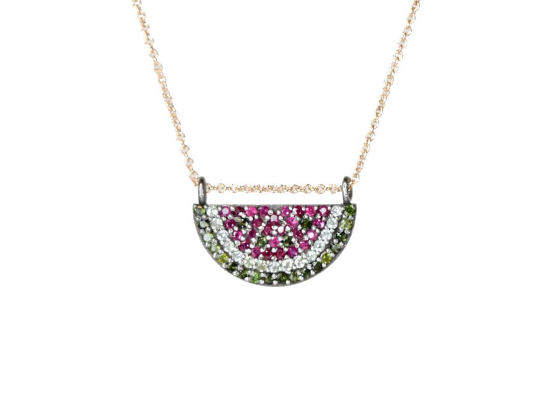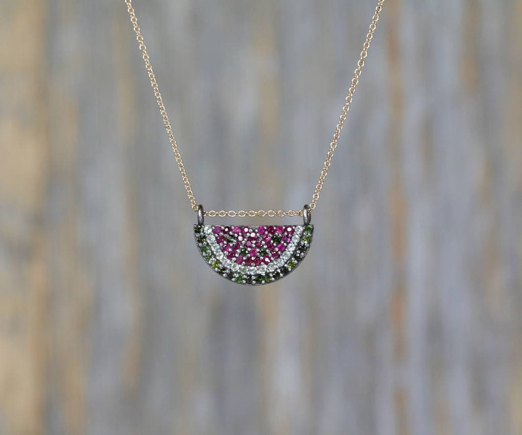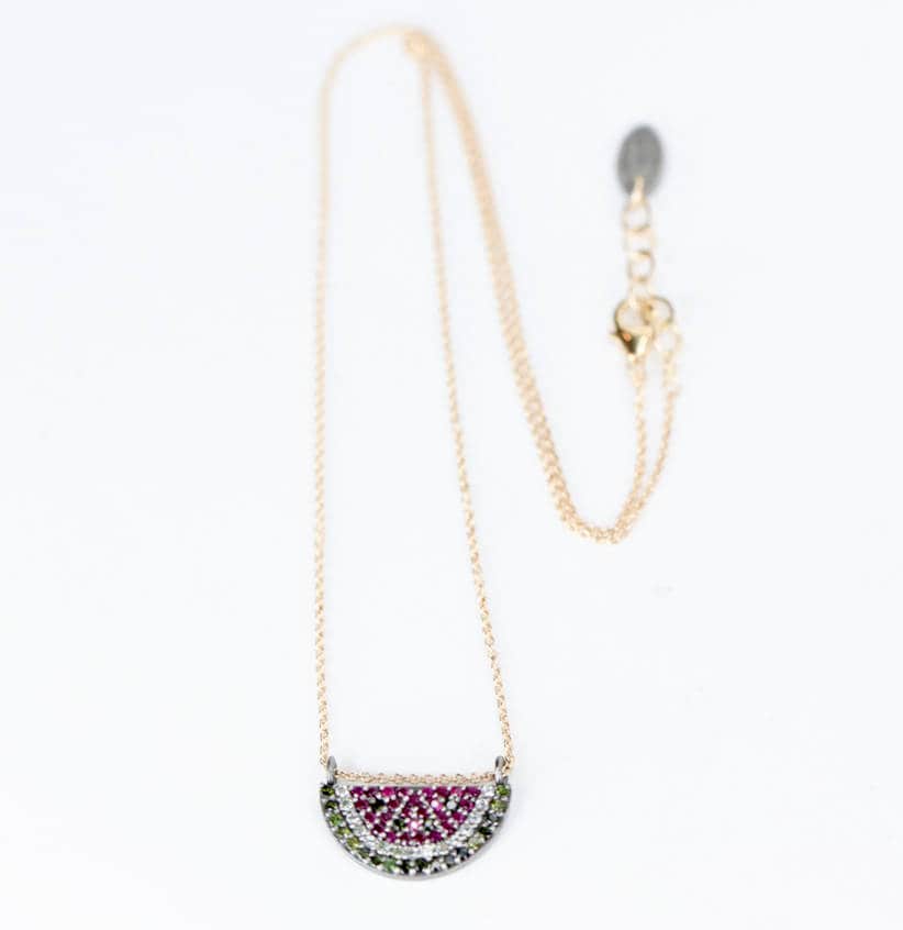 This adorable pave gemstone watermelon pendant necklace is designed with high quality faceted pave gemstones.